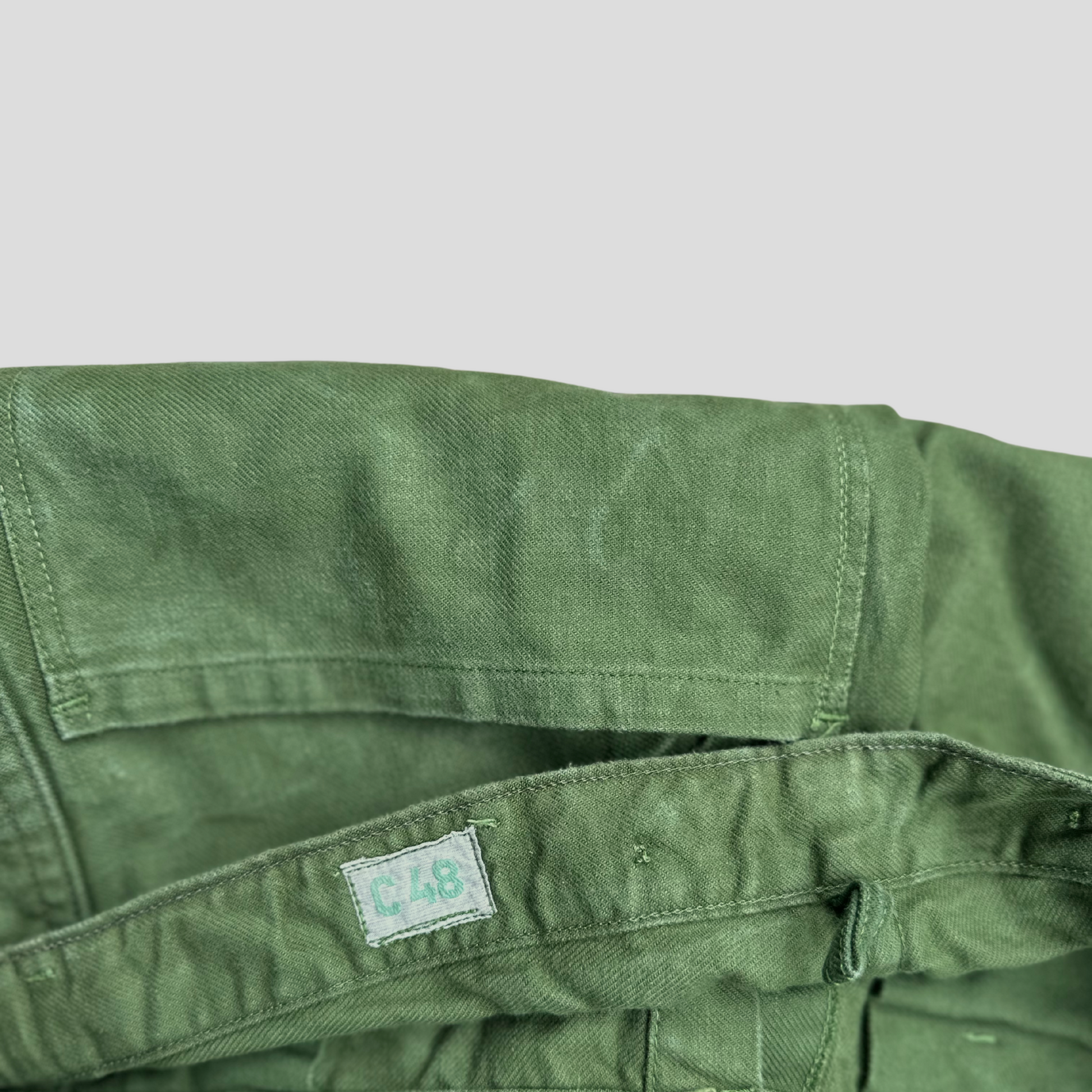 A pair of high waisted Swedish military pants from 1961. Light green color. Equipped with a adjustable waist band. One single back pocket. Originally used with leather strap to tighten the leg opening. The pants have a loose fit.