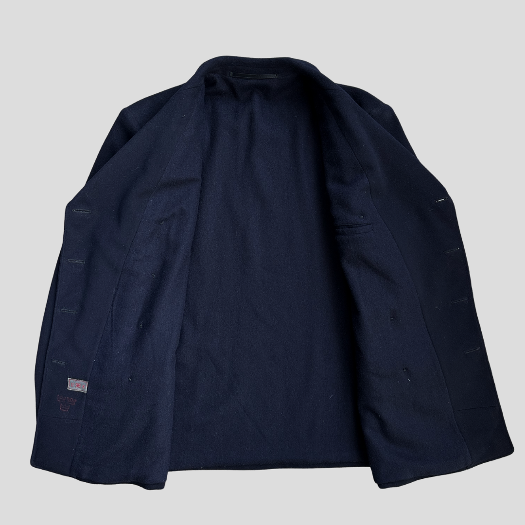A classic peacoat used by the Swedish Navy. Woven from dense, thick and durable wool. Equipped with two front pockets with flaps. This peacoat is in great condition. Marked with the three crowns of Sweden.