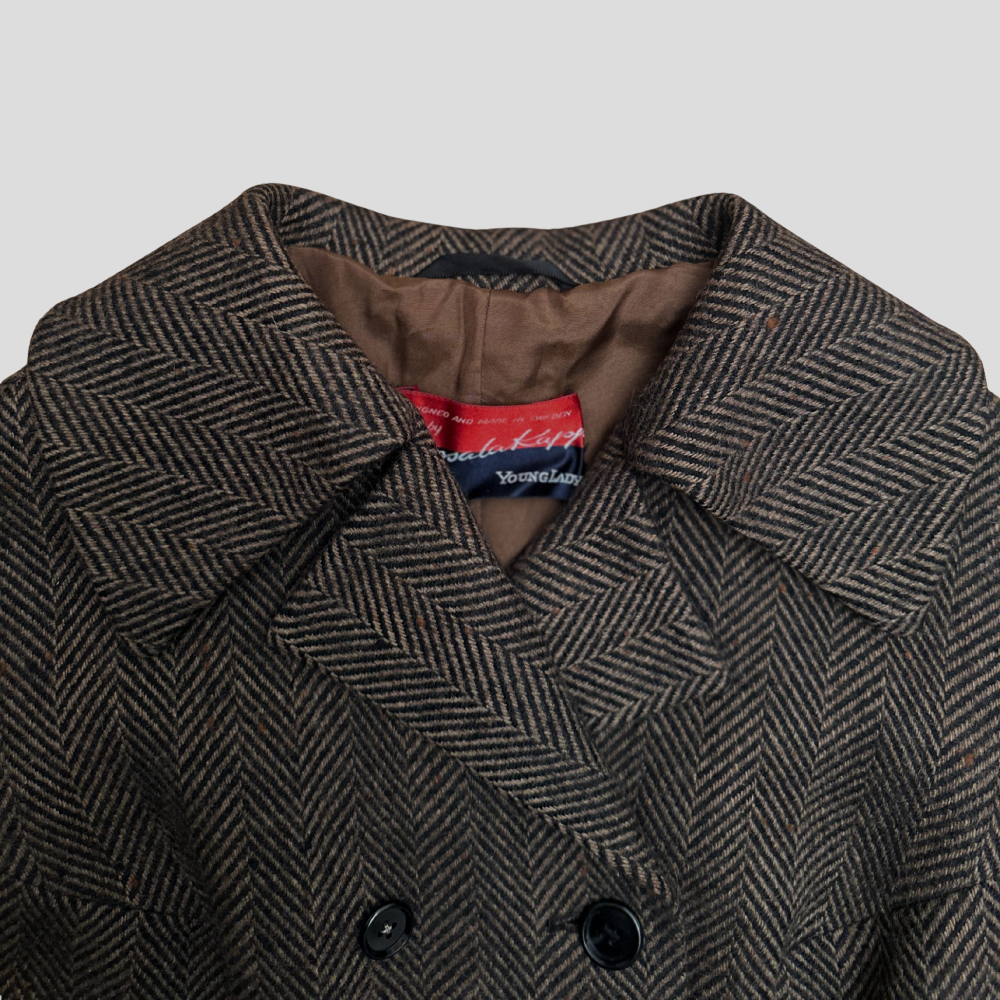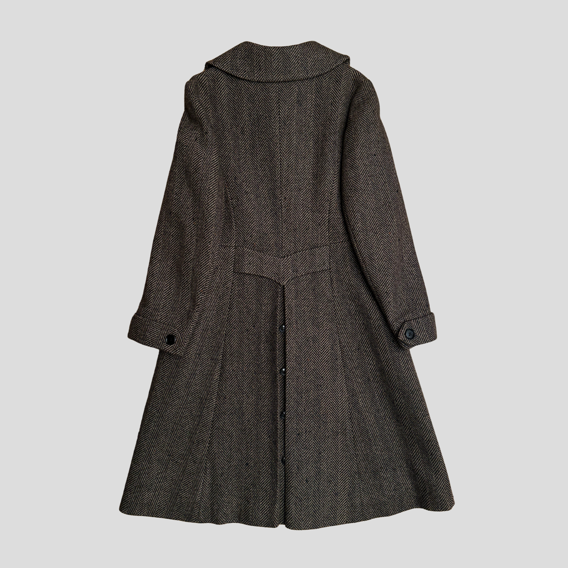 Double breasted tailored wool coat from UppsalaKapp. It features two side pockets and a slit down back. Made in Sweden.